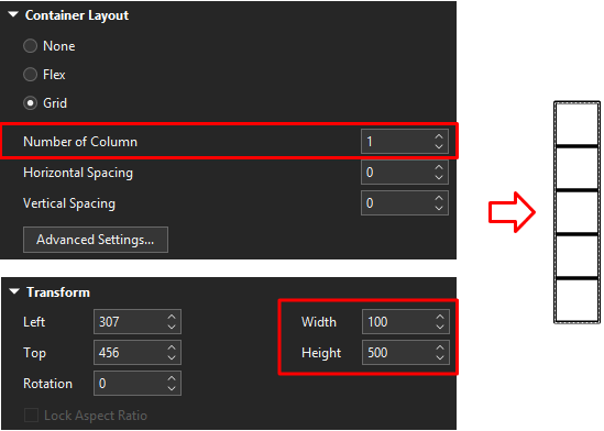 For vertical crosswords containing 5 cells, you can copy a horizontal crossword created earlier. Then, re-set the Number of Column to 1 and re-adjust the size to 100px wide and 500px high, for example.