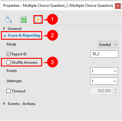 To do that, just select the answer area, then navigate to the Properties pane > Interactivity tab (1) > Score and Reporting section (2) > select the Shuffle Answers check box (3):