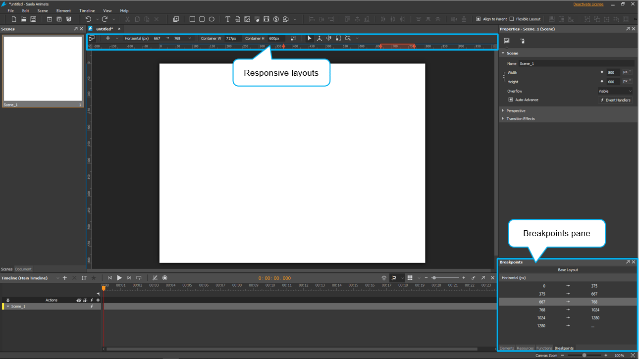 If you want to create a responsive project, select the Responsive Layout check box. In a responsive project, each scene has different layouts created based on breakpoints. The scene size starts at 100% of the container and the viewport width is set to the device width.