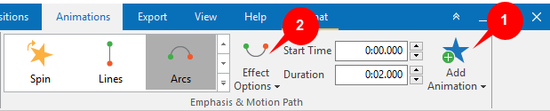 Step 3: Click Add Animation (1) and select one motion path from the gallery (Lines, Arcs, Turns, Shapes, Loops, Starts, and Custom Path).