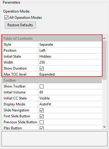 - Parameters (3) contains parameters and their values to customize the table of contents, toolbar, and color of the Player.