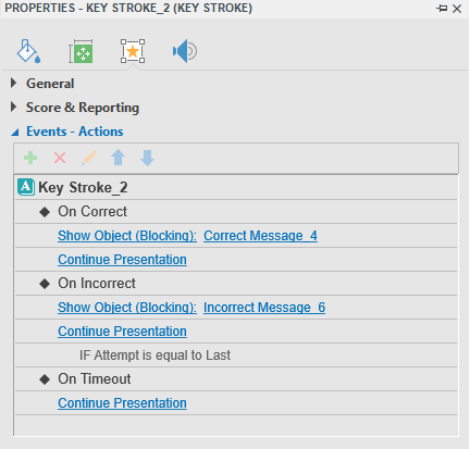 To set up events and actions for key strokes, access the Events – Actions section in the Properties pane. key strokes 04 By default, key strokes have three events, namely On Correct, On Incorrect, and On Timeout. You can add three other events, namely On Key Press (occurs when each key or combination of keys is pressed), On Rollover, and On Rollout. For more details, see Working with Events – Actions.