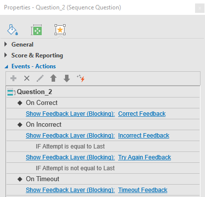 Sequence questions have default events and actions. In the Graded mode, a Sequence question has three events: On Correct, On Incorrect, and On Timeout. However, it just has two events in the Survey mode, which are On Complete and On Timeout. If you’ve selected the Graded mode early on, this is what you’ll see:
