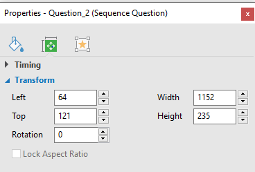 - Resize the question: Select the whole question and drag the resizing handles. Alternatively, access the Properties pane > Size & Properties > Transform > type values in the Width and Height boxes. When you’re done with this, if you want to restore the original size, right-click the question and select Reset Placeholder.