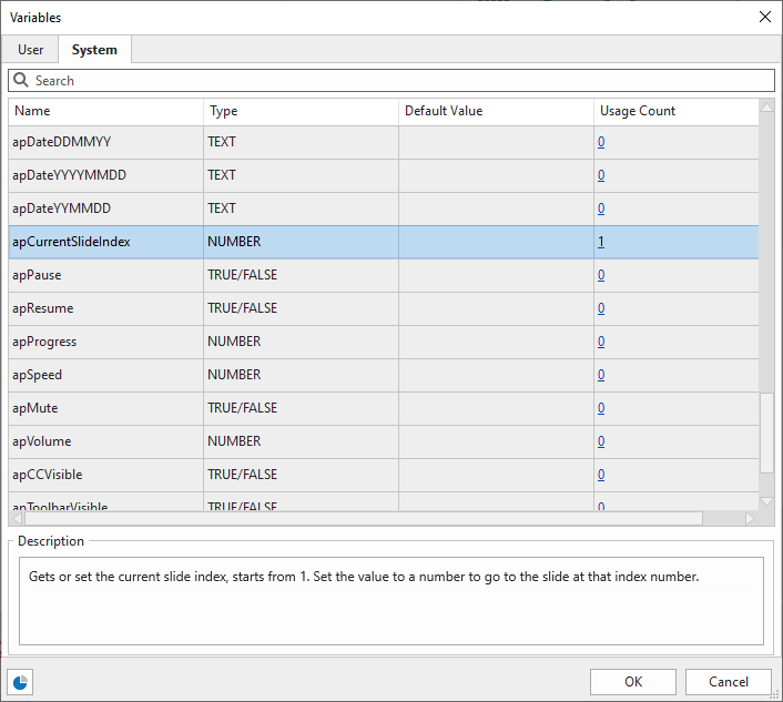 Step 2: Add variable to the text caption. In the Home tab, click Reference, and then select apCurrentSlideIndex in the system tab of the Variables dialog.