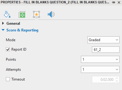 To set score and reporting for the question, select the answer area, then, go to the Properties pane > Interactivity tab > Score & Reporting.