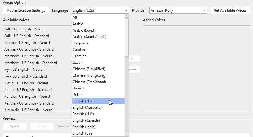 • Click the Provider combo box to choose among three providers, which are Amazon Polly, Google Cloud, Microsoft Azure, or all of them. The available voices of the selected language of the corresponding provider will be shown in the Available Voices list.