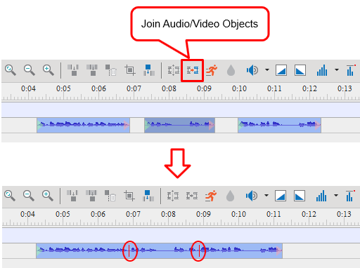 Step 2: Click the Join Audio/Video Objects button. As a result, all the selected audio/videos will merge based on ascending order of their start time. In other words, the audio/video with a smaller start time will play first in the combined audio/video. As can be seen, these red marks show where audio/videos join.