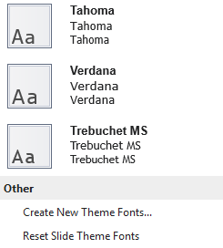 In case the new Theme Fonts don’t please you, click Reset Slide Theme Fonts to restore the original Theme Fonts. This option is at the bottom of the theme font gallery.