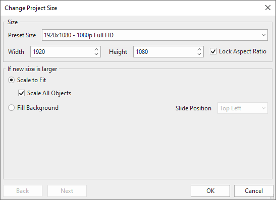 When you click the Slide Size or Change Size button, the Change Project Size dialog appears.